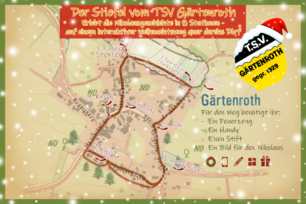 🎄 Der Stiefel vom TSV Gärtenroth – Unser interaktiver Weihnachtsweg für die ganze Familie Ab dem 6. Dezember 2025 verwandelt sich Gärtenroth in einen Ort voller Weihnachtszauber ✨: Der TSV Gärtenroth lädt ein zum interaktiven Weihnachtsweg „Der Stiefel vom TSV Gärtenroth“ – ein liebevoll gestalteter Spaziergang mit 8 spannenden Stationen für Groß und Klein. 📍… 🎄 Der Stiefel vom TSV Gärtenroth – Unser interaktiver Weihnachtsweg